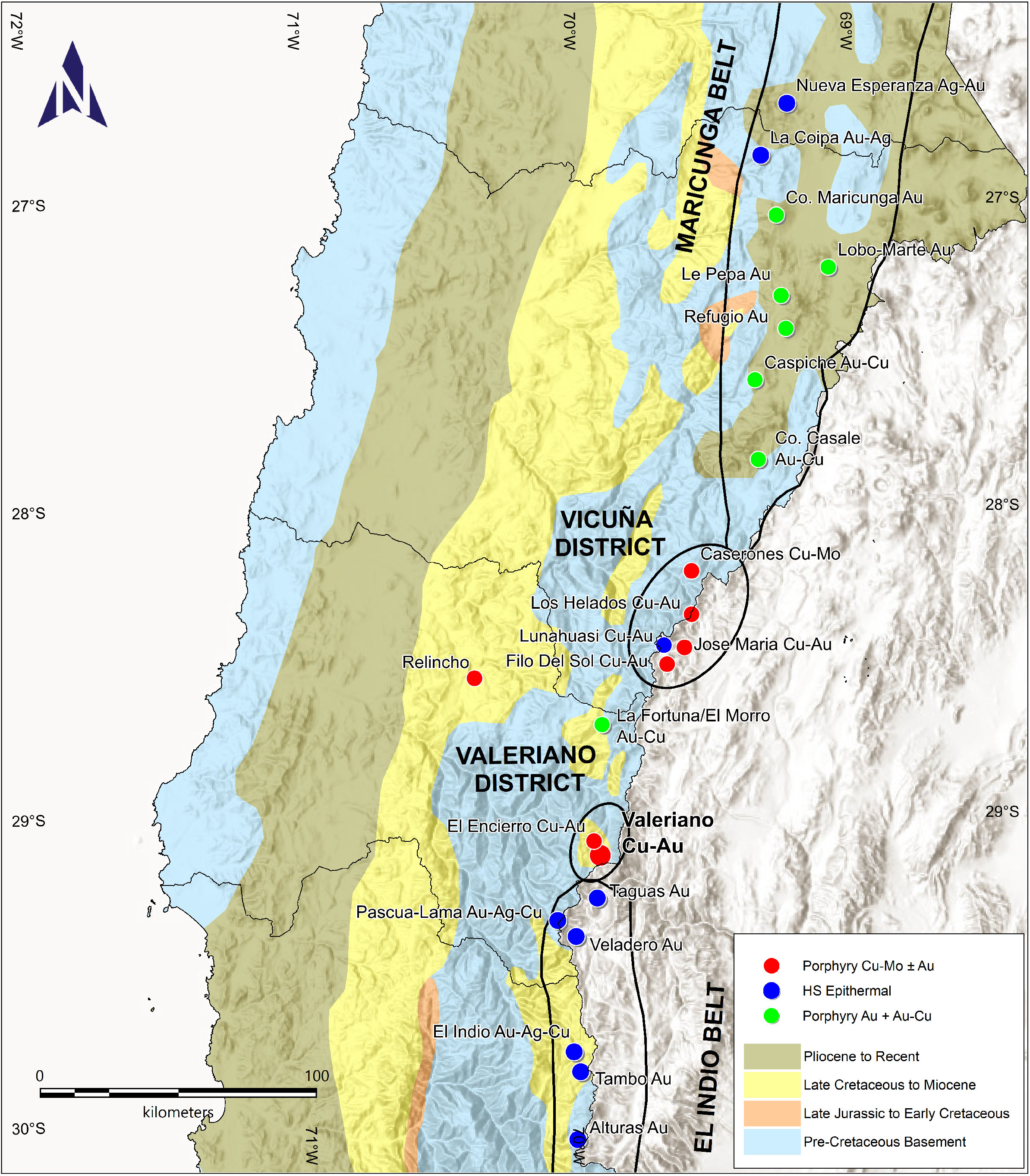 The Valeriano Project is located within the roughly north-south trending Miocene to early Pliocene metallogenic belt that stretches along the eastern Chilean and western Argentinian border, continuing north into Peru (Sillitoe and Perelló, 2005). The Project is located within this metallogenic belt in an area situated between the northern limit of the El Indio Belt (Siddeley, G., and Araneda, R., 1990) and the southern margin of the Maricunga Belt. ATEX refers to this emerging trend between these belts as the “Link Belt” (Figure 1). Both the El Indio and Maricunga Belts host numerous significant copper and gold deposits and have seen extensive exploration since the 1900’s. The Link Belt has seen increased exploration since the early 2000’s leading to the discovery of several significant copper and gold deposits.